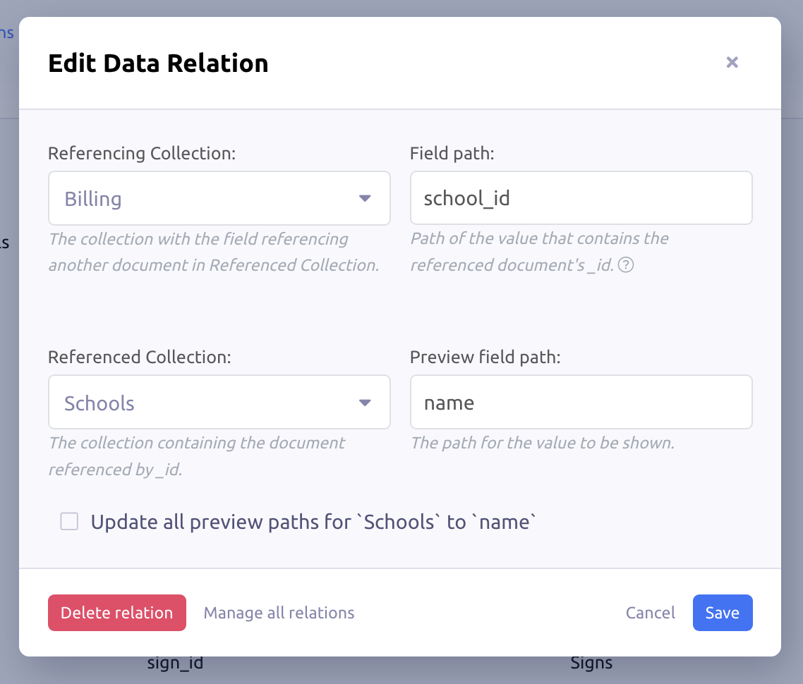In the above screenshot, the first relation means the following: Documents from the Billing collection reference by the field "school_id" documents in the Schools collection. The "name" field in the Schools collection was chosen to show a more human value.
