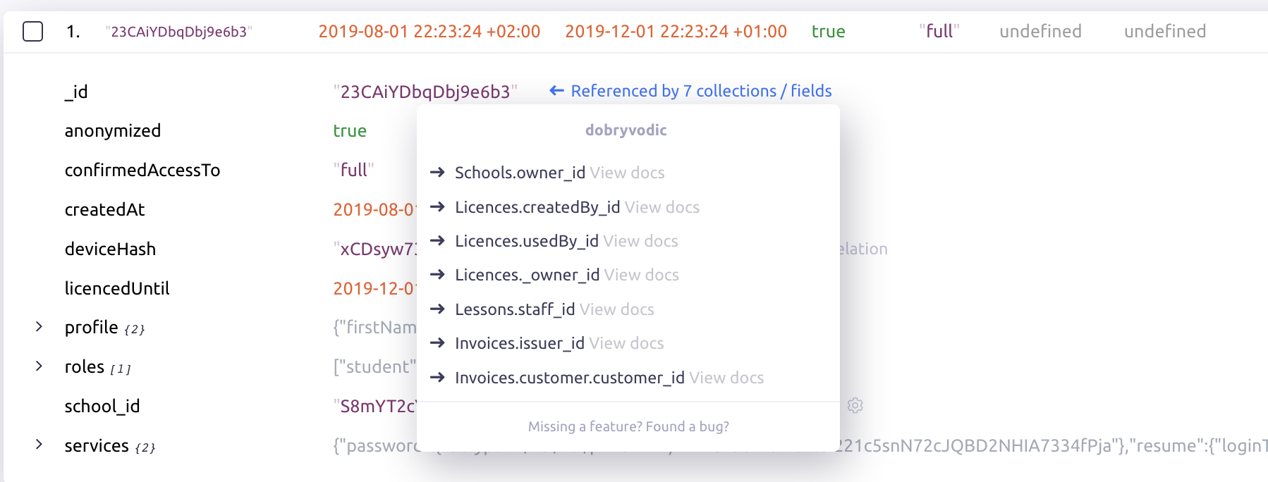 Mingo searches through samples of documents from each collection and identifies fields that look like an _id. Then it tries to find those _id's in the database. When found, it creates a relation and guesses the best field to show as a preview. In the example above, the document references the Schools collection document and the "name" field was chosen to be the preview value.
