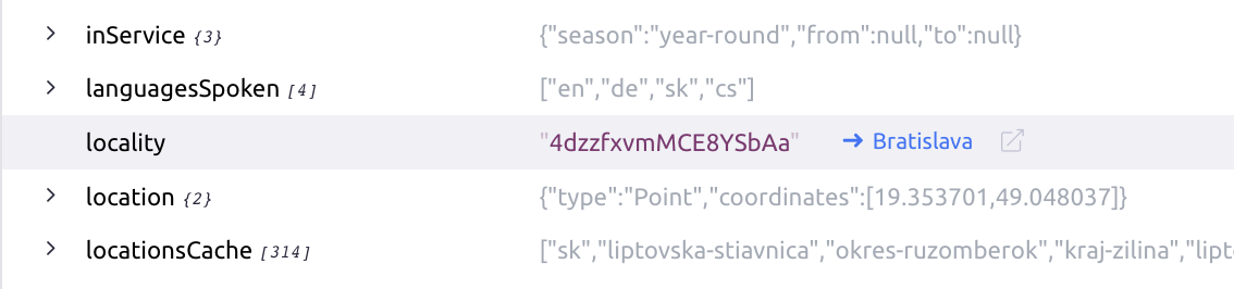 The field "locality" references locations, so Mingo shows that the _id "4dzzfxvmMCE8YSbAa" is actually the city of Bratislava.